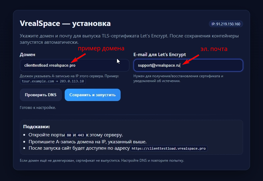 2. После завершения процесса распаковки терминал предоставит вам веб-ссылку (пример). Скопируйте и откройте ее в браузере. В открывшемся окне задайте поддомен вашего сайта, на котором будет размещаться ваш виртуальный тур (например: 3dtour.ваш-домен.ru), а также введите ваш e-mail. После этого нажмите на кнопку “Проверить DNS” и вы увидите статус “DNS OK”, если все впорядке. После чего нажмите кнопку “Сохранить и запустить”. После сохранения настроек мастер автоматически запустит контейнеры и завершится.
