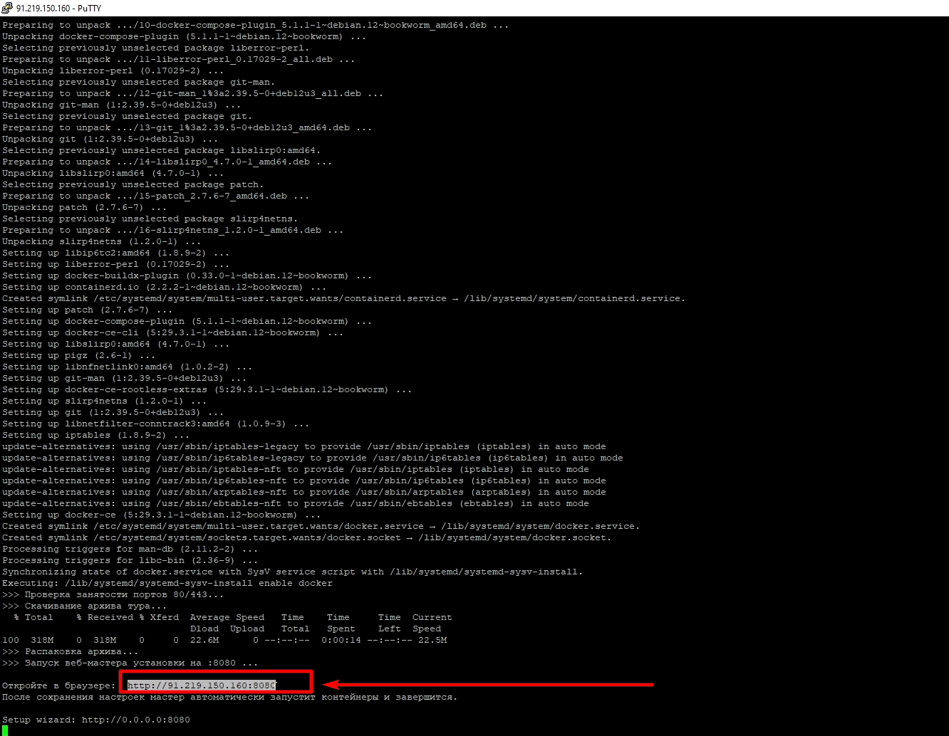 1. Скопируйте из файла с инструкцией команду для установки проекта (здесь) и введите ее в терминале. После чего запустится процесс распаковки архива на вашем сервере.